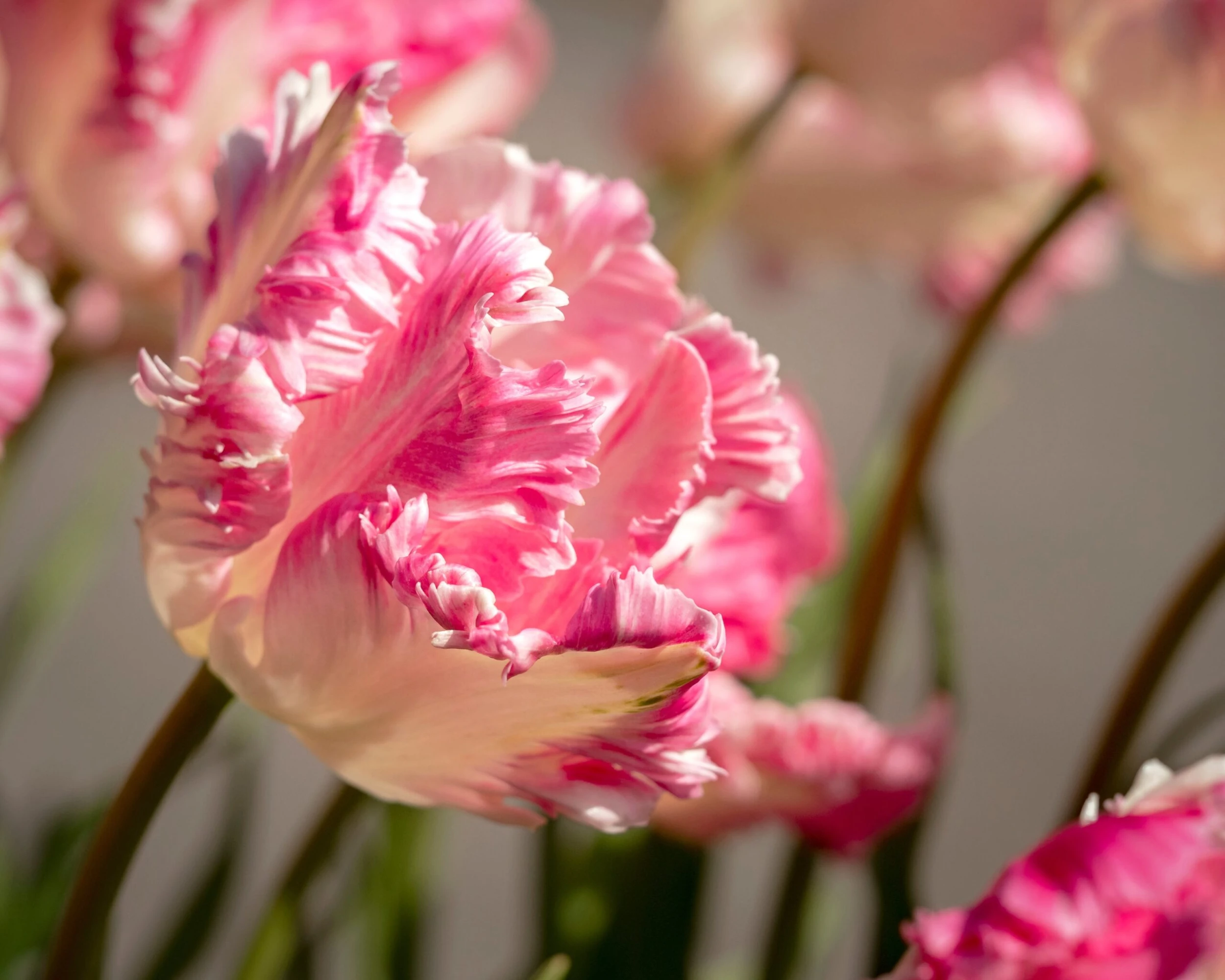 Parrot tulips are treasured for their twisted, curving petals that curl like yoga-masters into the most alluring shapes. Famed for their extravagant, ruffled petals, the over-sized flower heads make an impressive statement in late spring. The creamy-white petals of Tulip ‘Cabanna’ are infused apple-green which gradually colours through sugared-almond shades of soft pink. As each bloom reaches its peak, the feathered markings deepen to bright fuchsia. When planted in generous group, the lavish Tulip ‘Cabanna’ creates a frilly embroidery of undulating petals in the softest shades.