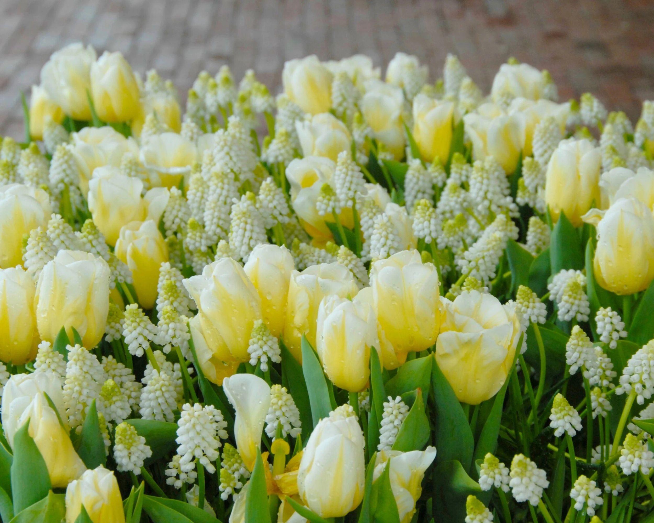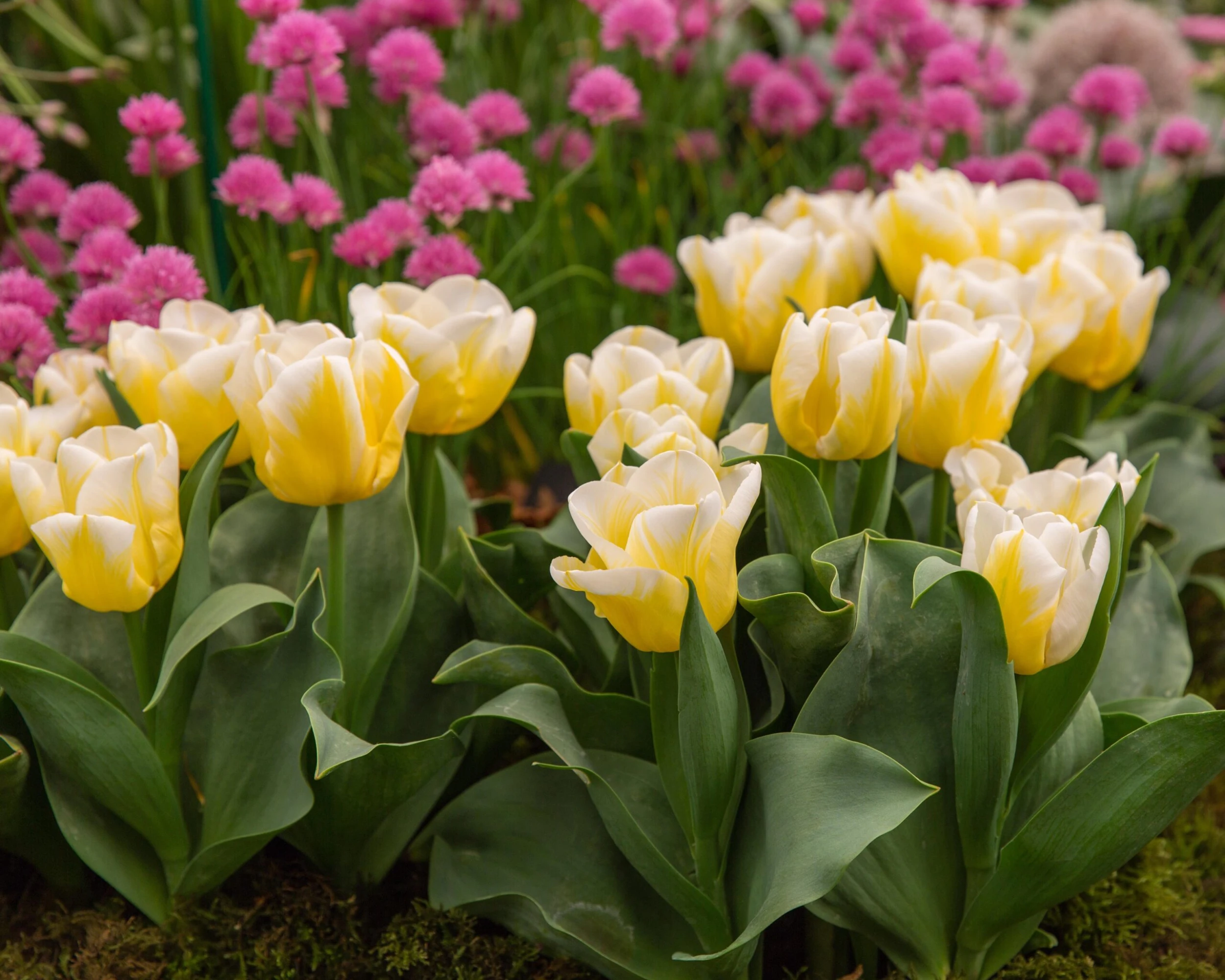 Bulb lasagnes are one thing, but how about a bulb trifle with this cream and custard-coloured Tulip ‘Calgary Flames’! Plant en-masse in swathes through borders or use them to fill pots, paired with complementing colours like pale green or pastel pink. A notable characteristic of this tulip is its short stems (often shorter than 25cm) and large flowers, making it useful for planting in smaller containers or in more exposed, windy areas. This versatile tulip also works well as an underplanting with taller tulips—it would look fantastic with Tulip ‘Evergreen’ or ‘China Town’.
