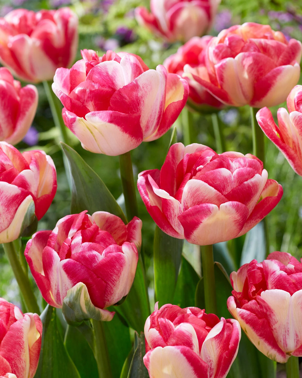 Tulip ‘Double Blizz’ is a brand-new variety and is not widely available—yet! It has performed wonderfully well in trials and we predict a very bright future for it. The petals of this tulip are delicate-looking, yet sturdy. They are fuchsia-pink and white, in near enough equal measure, often with green markings in the white sections. The flowers are beautifully bowl-shaped, and become even more dramatic when they open out fully. They appear over several weeks in April and May. From a distance, you could easily mistake these late-flowering tulips for dramatic peonies, so Tulip ‘Double Blizz’ is an excellent choice for extending the blooming season.Â