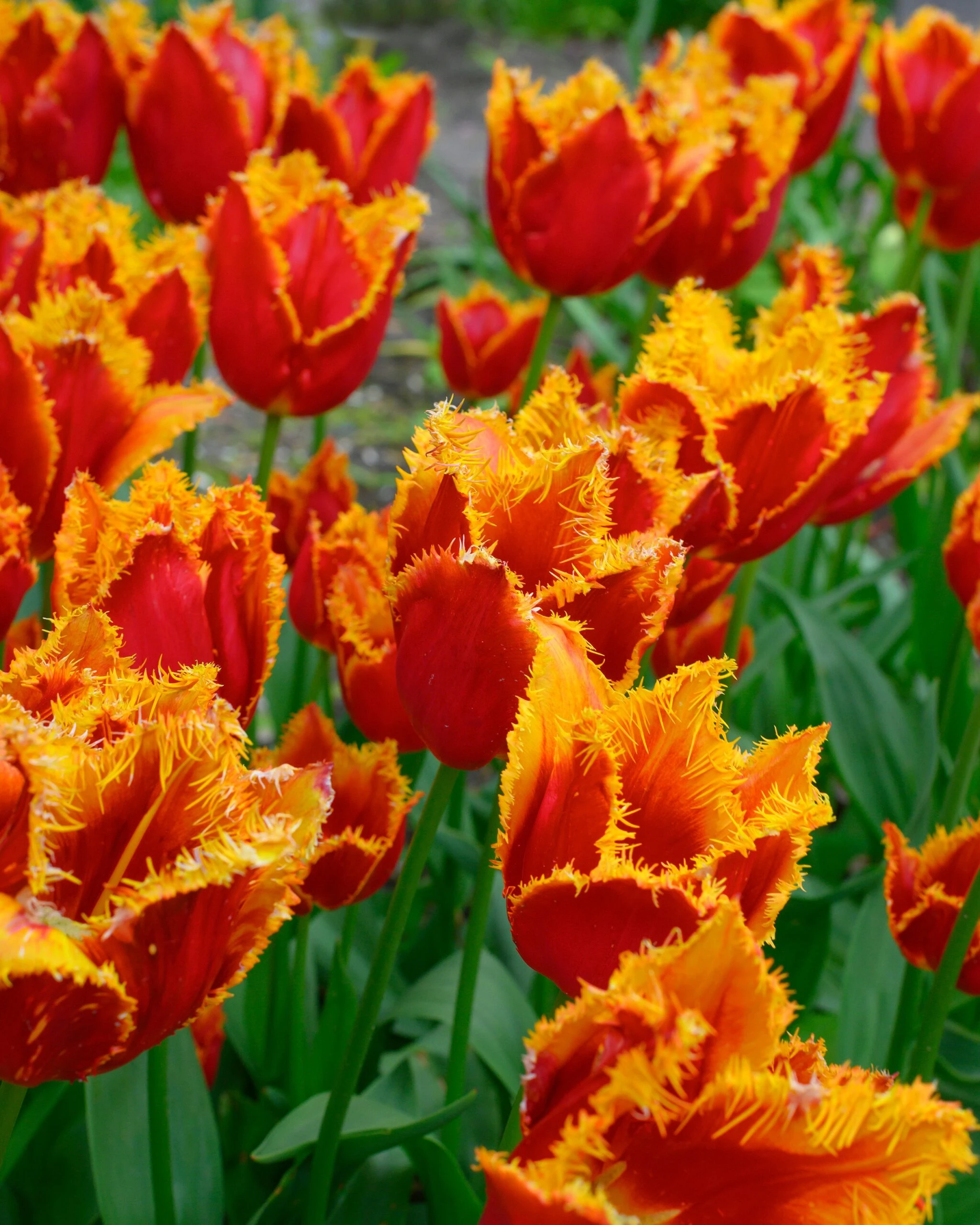Fringed Tulip ‘Fabio’ is a gorgeous mid-season tulip variety, and it has certainly caught the eye of enthusiasts. It has performed wonderfully well in trials and now gardeners are starting to buy it in their thousands. The dark, orange-red petals of Tulip ‘Fabio’ have all the frills—they are tipped with yellow, fringed edges, making for an unusual combination in both colour and form. These flowers, which appear over several weeks in spring, really stand out from the classic mid-green leaves. Their unique shape creates beautiful texture in the garden. It is one the strongest crispa—or fringed—tulips available.